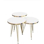 - Il piano di appoggio di questo set di 3 tavolini da caffè rotondi è realizzato in legno MDF di prima qualità rivestito in nastro PVC di color bianco lucido con contorni dorati mentre la struttura è completamente in filo di metallo dorato che li rendono piu’ chic. Grazie alla sua struttura stabile , solida e robusta puoi appoggiarci tutto quello che vuoi. Dotato di tre gommini antiscivolo ed antigraffio. Prodotto in Turchia